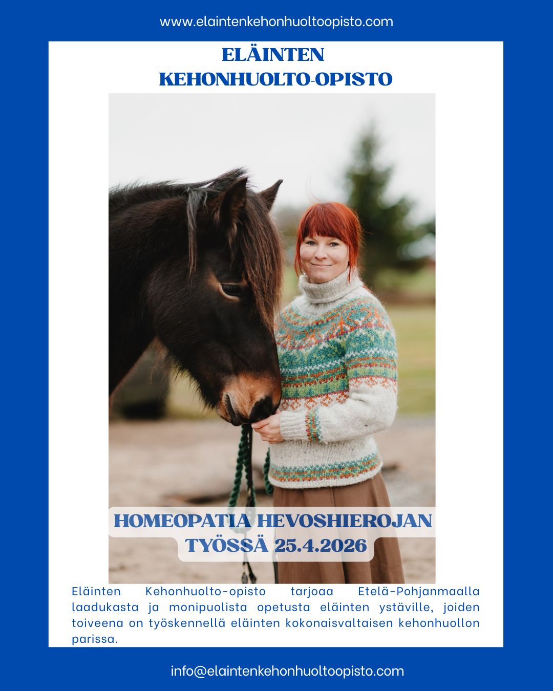 Tässä yhden päivän (koulutus kestää 5-6 h) etäkoulutuksessa käymme läpi homeopatian perusteet nimenomaan hevoshierojan näkökulmasta. Painopiste on akuuteissa ja yleisissä perusvaivoissa sekä esimerkkitilanteita, jotka ovat suoraan sovellettavissa kehonhuollon arkeen.